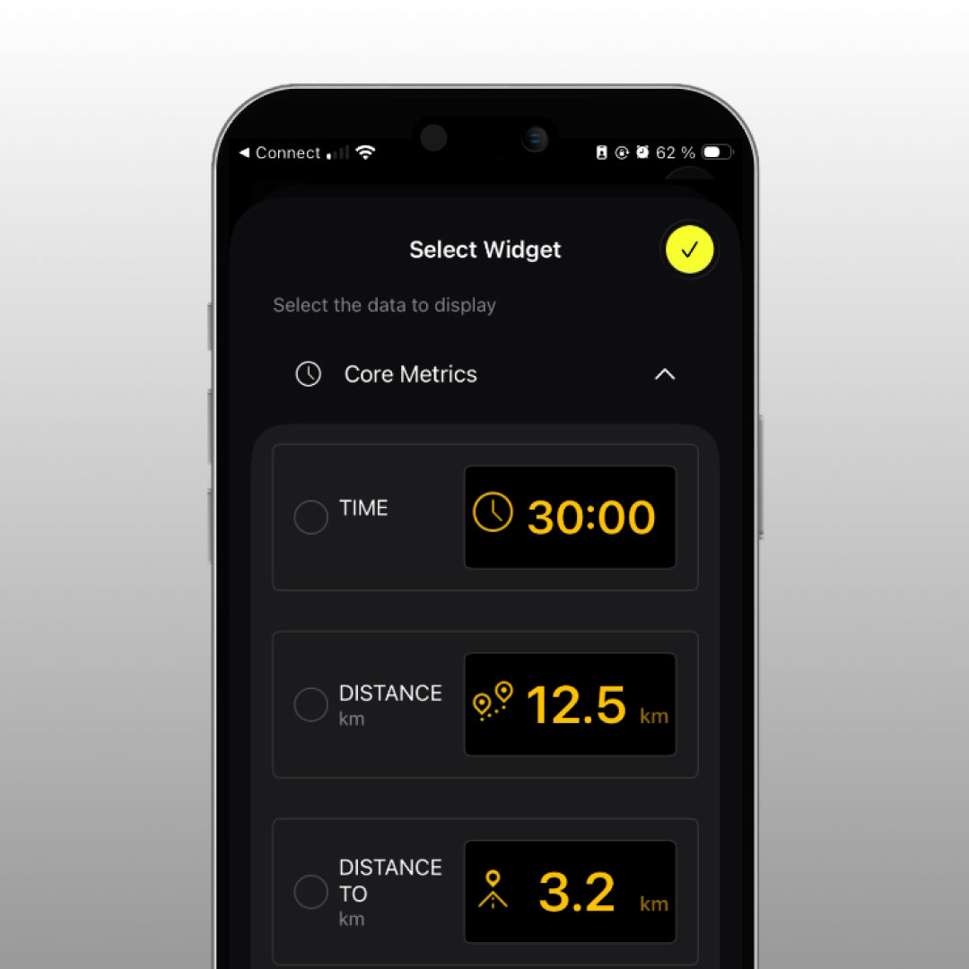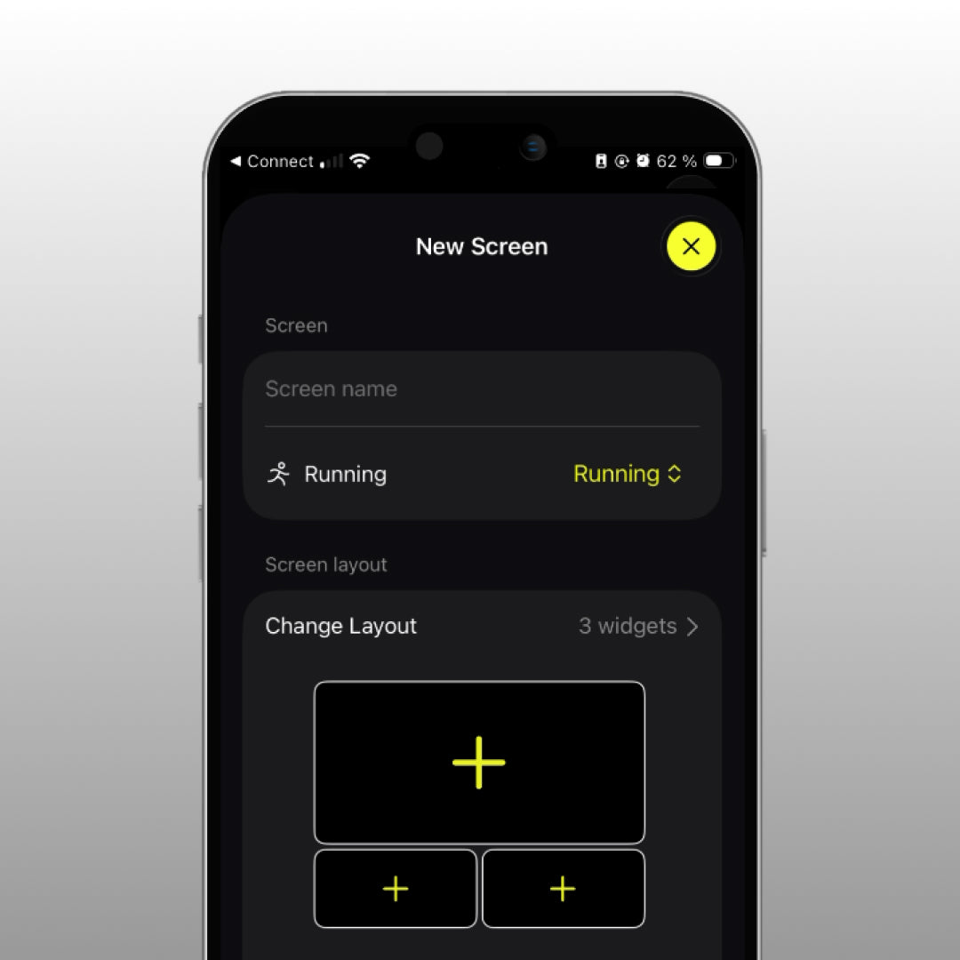 Tap the plus sign to add a widget to each space. Choose from core metrics, heart rate, power, and more. Your changes appear on your engo3 in real time.