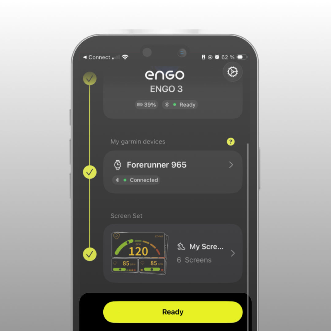 When connected, you will see a yellow check mark on the watch and a "Ready?" message in your engo3.
